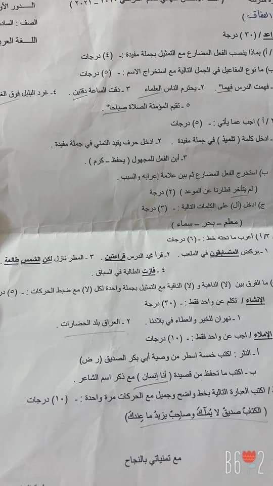 صور لجميع اسئلة اللغه العربيه للسادس الابتدائي من مختلف مدارس العراق للامتحانات النهائي لعام 2021