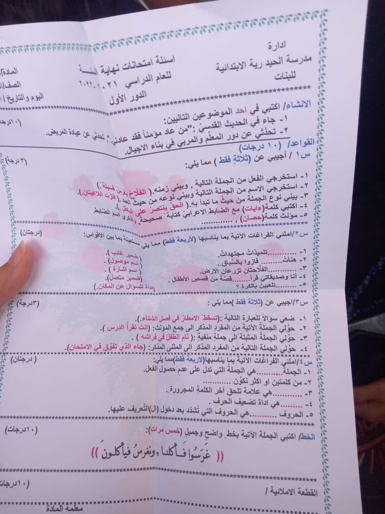 اسئلة الامتحانات اخر السنه لمادة العربي لصف الخامس الابتدائي لعام 2022 دور اول
