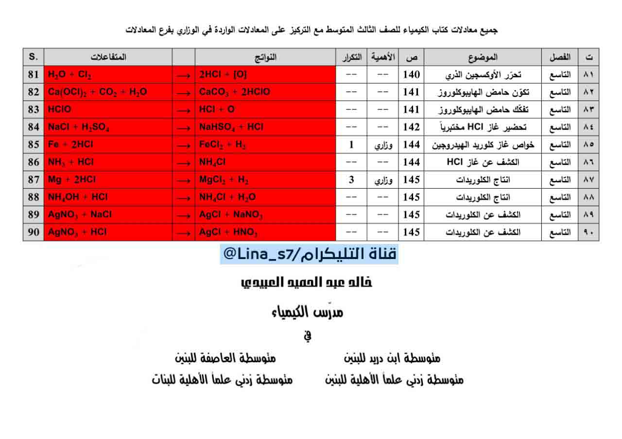 جميع المعادلات الموجوده في كتاب الكيمياء للصف الثالث متوسط مع التركيز على المهمات والوزاريات بحسب الحذوفات للمنهج للاستاذ خالد العبيدي