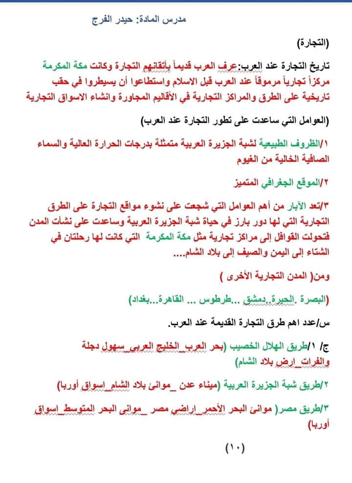 مختصر اجتماعيات صف الثاني متوسط للفصل الثاني مكون 9 ورقات للاستاذ حيدر الفرج