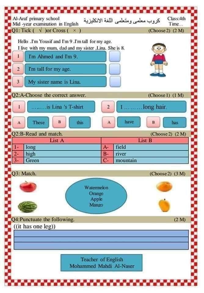 اسئلة نصف السنه لمادة الانكليزي لصف الرابع الابتدائي مع الحلول نماذج عدد 9 لعدة اساتذه