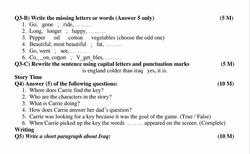 اسئلة اللغه الانكليزيه للاول المتوسط في اليونت الخامس لشهر اذار مع الحل اعداد الاستاذ عمر محمد العبيدي